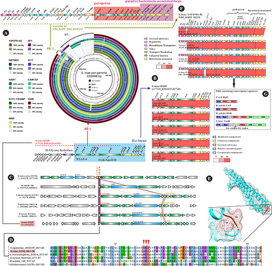 Figure 2: BLASTN-based sequence comparison of nine Streptococcus iniae strains against the S. iniae pangenome reference generated using Gegenees. (A) Circular representation of comparison between the pan-genome and the nine S. iniae genomes obtained with BRIG [37]. The image shows similarities between a central pan-genome and nine S. iniae genome sequences as a set of concentric rings, where BLAST matches are coloured on a sliding scale indicating a defined percentage identity (thresholds set at default 98% and 95%). The innermost rings represent GC content (black) and GC skew (purple/green) of the pan-genome. The positions of the plasticity regions are marked in the outer ring. Plasticity zone(PZ)- I with some gene clusters (using S. iniae DX09 as an example) is shown on the dashed line. The Ess locus is in the blue box (below). PZ-I was unique to S. iniae strains DX09, ISET0901, ISNO, CAIM 527, IUSA1 and SF1, and absent from the strains YSFST01-82, 9117 and KCTC 11634BP. PZ-II with a gat operon (red box) and putative bacteriocin-associated locus (purple box) is presented at the top of the olive dashed line (S. iniae YSFST01-82). PZ-II was unique to S. iniae strains YSFST01-82, 9117, CAIM 527, KCTC 11634BP and IUSA1, and absent from the genomes of DX09, ISET0901, ISNO and SF1. ME, mobile elements including prophages, integrative and conjugative elements and insert sequences. (B) Detailed comparison of the Ess locus between DX09 (blue box in Figure 2A) and other S. iniae possessing the Ess locus in Figure 2A. Regions with nucleotide identity >77% are connected by red windows using a colour intensity gradient based on the identity scores of BLASTN comparisons in WebACT. The Ess locus from the start of esxA to the end of a unknown component (such as A7N10_RS03715 in DX09) covers ~14 kb and is almost 100% identical between the DX09, ISET0901, ISNO, CAIM 527, IUSA1 and SF1 strains (only two differences over this region). Hallmark genes of the Ess locus are indicated in the top panel. Accession numbers of ISET0901, ISNO, CAIM 527, IUSA1 and SF1 are presented on the left. Accession numbers of DX09 are given on the top and omitted in subsequent comparisons. Arrows of the same colour indicate homologous genes among bacteria. Genes encoding secreted substrates are coloured in red, membrane components in green, cytoplasmic components in blue, and unknown components in yellow. Putative unrelated genes are shaded in grey. (C) Comparison of different type VII secretion systems (T7SS, encoded by the Ess locus) between DX09 with Ess-containing Gram-positive bacteria, including Actinobacteria (Mycobacterium tuberculosis strain H37Rv) and Firmicutes (Bacillus subtilis strain 168, Listeria monocytogenes strain EGD-e, Streptococcus agalactiae strain 2603V/R and Staphylococcus aureus strain Newman). Colour codes are presented in the key. Type VII secretion systems are indicated and all region-specific genes shaded in grey. Members of the FtsK/SpoIIIE and ESAT-6/WXG100 families are both present in all the different type VII secretion systems. The dashed line represents homology of FtsK/SpoIIIE (blue arrow) and purple/pink region homology of the ESAT-6/WXG100 family. Other T7SS-related genes in each bacterial specimen are coloured in green. Putative unrelated genes are shaded in grey. (D) Protein sequence alignment of DX09 EsxA with ESAT-6/WXG100 proteins from other Gram-positive bacteria. All six proteins contain the tryptophan-variable-glycine (WXG) motif (red inverted triangle). (E) Predicted structure of the EsxA protein in DX09. The WXG motif is indicated in red. (F) Detailed comparison of the PZ-II loci between S. iniae YSFST01-82 and other S. iniae strains possessing PZ-II in Figure 2A. Regions with nucleotide identity > 77% are connected by red windows using a colour intensity gradient based on identity scores of BLASTN comparisons in WebACT. The Ess locus was almost 100% identical between the YSFST01-82, 9117, CAIM 527, KCTC 11634BP and IUSA1 strains (only mobile elements with some transposase sequences are different over this region). Hallmark genes of PZ-II are indicated in the top panel. Accession numbers of 9117, CAIM 527, KCTC 11634BP and IUSA1 are presented on the left. Accession numbers of YSFST01-82 are presented at the top and omitted in subsequent comparisons. (G) PRD-containing regulators as multidomain proteins potentially containing EIIB-like and EIIA-like domains. Antiterminators BglG (from Escherichia coli) and licT (from B. subtilis) share similar domain structures, both containing the RNA binding domain (RBD) that can mediate antitermination activity. The PRD-containing transcriptional activator MtlR (from B. subtilis) and putative PRD-containing transcription activator GatR (from S. iniae) share similar domain structures. Both contain two DNA-binding domains, HTH and Mga, and EIIB-like and EIIA-like domains. Images were generated with the software CorelDRAW X6. Copyright (c) 2015–2016 [Tao Liu] and CorelDRAW X6. All rights reserved.