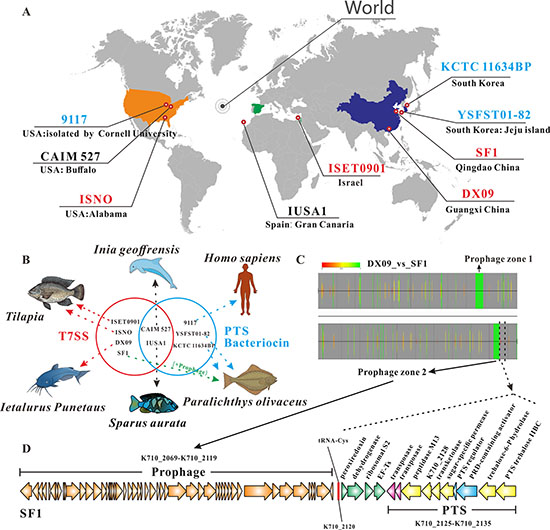 Figure 3: Plastcity zone (PZ)-I and PZ-II contribute to adaptation in different host niches. (A) Geographical distribution of all sequenced Streptococcus iniae. Strains with PZ-I are coloured red; strains with PZ-II are coloured blue; strains with both PZ-I and PZ-II are coloured black. (B) Strains isolated from different hosts present different genome features. PZ-I-containing strains with T7SS are in the red circle; PZ-II-containing strains with PTS and bacteriocin-related locus are in the blue circle; the overlapping region represents strains with both PZ-I and PZ-II. The arrows indicate different hosts for the above strains. (C) Signature analysis of S. iniae SF1 with Gegenees software [54]. A fragmented alignment was performed at 500/500 settings with BLASTN (BLAST+) using S. iniae DX09 as the target genome group and SF1 as the background. The ‘maximum background/average target’ setting was used for biomarker score calculation. Annotations are derived from S.iniae SF1 (GenBank: CP005941). Prophage zones 1 and 2 were identified in SF1. (D) Gene organization in Prophage zone 2 from SF1 and gene cluster with trehalose-PTS located downstream of Prophage zone 2. Images were generated with CorelDRAW X6 software. The base maps in Figure 3B were created using ChemDraw2010 and CorelDRAW X6. Copyright (c) 2015–2016 [Tao Liu], CorelDRAW X6 and ChemDraw2010. All rights reserved.