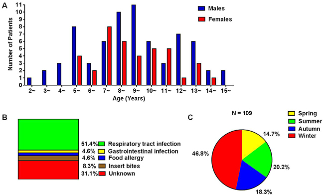 A total of 109 children with HSP were enrolled in the study, including 70 males and 39 females. The ratio of male to female was 1.79:1. The average age of onset of HSP was 8.74 ± 2.99 years (range of 2 to 15 years). About 76.1% cases occurred in those aged 5-13 years, with male to female ratio of 1.58:1 (Figure 1A). The peak season for HSP attack was winter, while HSP onset occurred during all seasons (Figure 1B). Most cases had a certain predisposing factor before disease onset, among which 56 had a respiratory tract infection, 5 had a gastrointestinal infection, 5 had eaten special food like egg and fish that caused a food allergy, and 9 had been accepted a vaccine injection, while 34 cases were triggered by unknown factors (Figure 1C). A total of 53 healthy children were enrolled, including 28 males and 25 females. The ratio of male to female was 1.12:1. The average age of 53 healthy children was 7.91 ± 3.07 (range of 2 to 14 years). There were no significant differences in gender or age between HSP and HC.