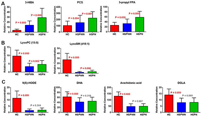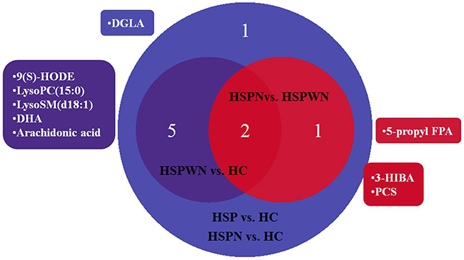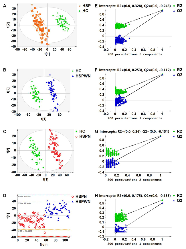 Metabolic profiling revealed significant metabolic differences among HC, HSPWN and HSPN groups. The PCA score plot of all samples displayed clear separation for HSP vs. HC, suggesting that HSP led to a series of metabolic changes in affected children. The PLS-DA model for HSP vs. HC revealed significant alterations of HSP progress. Ulteriorly, PLS-DA models for HSPWN vs. HC, HSPN vs. HC, and HSPN vs. HSPWN suggested some characteristic underlying pathophysiological changes associated with renal involvement in HSP. A total of 9 potential biomarkers were identified; with 9 significantly varied for HSP vs. HC, 3 significantly varied for HSPN vs. HSPWN, 7 significantly varied for HSPWN vs. HC, and 9 significantly varied for HSPN vs. HC.