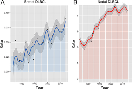 Several important conclusions can be derived based on our results. We observed that the incidence rate of breast DLBCL, especially in whites (APC = 3.0; 95% CI = 2.1–3.8), is increasing overtime, which may be partly due to the increased awareness of the disease as a unique entity by pathologists and clinicians over time. Likewise, we also found a similar increase in the incidence trend of nodal DLBCL.