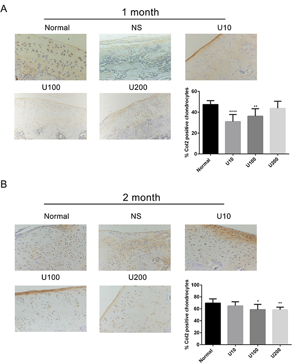 Aggrecan and Collagen Type 2(Col 2) are main biomarkers of cartilage matrix synthesis, the effect of PLCγ1 inhibition on them was then assessed with immunohistochemistry assay in a rat OA model. Considering the heavy cartilage degeneration in NS group, the difference between U73122-treated and normal groups was analysed. In 1 month-treated group, Figure 3A showed that the expression level of Aggrecan in U73122- treated groups at different concentrations was less than that in normal group (***P < 0.001). In 2 month-treated groups, the expression level of Aggrecan in U73122-treated groups at different concentrations was close to that in normal group (Figure 3B). These results indicated that the treatment of U73122 for 2 month enhanced the expression level of Aggrecan, reaching normal level, and that the efficacy of U73122 treatment for 1 month was inferior to that for 2 month. In addition, the expression level of Col 2 in U73122 (200 μg/kg)-treated group at for 1 month was close to that in normal group, whereas Col 2 expressions in the other two concentrations of U73122 were significantly less than that in normal group, indicating that the efficacy of U73122 (200 μg/kg) was superior to that of the other two groups (Figure 4A, **P < 0.01, ****P < 0.0001). In 2 month-treated groups, the expression level of Col 2 in U73122 (10 μg/kg)-treated group was close to that in normal group, whereas Col 2 expressions in the other two groups of U73122 were less than that in normal group, indicating that the efficacy of U73122 (10 μg/kg) treatment was superior to that of the two other groups (Figure 4B, *P < 0.05,**P < 0.01). Therefore, treatment of both U73122 (200 μg/kg, 1 month) and U73122 (10 μg/kg, 2 month) could enhance the expression of Col 2 reaching normal level, and that the efficacy of U73122 may partially depend on the time and concentration of its treatment. Consequently, definite concentration PLCγ1 inhibitors promoted matrix synthesis through increasing Aggrecan and Col 2 expression levels in a rat OA model.