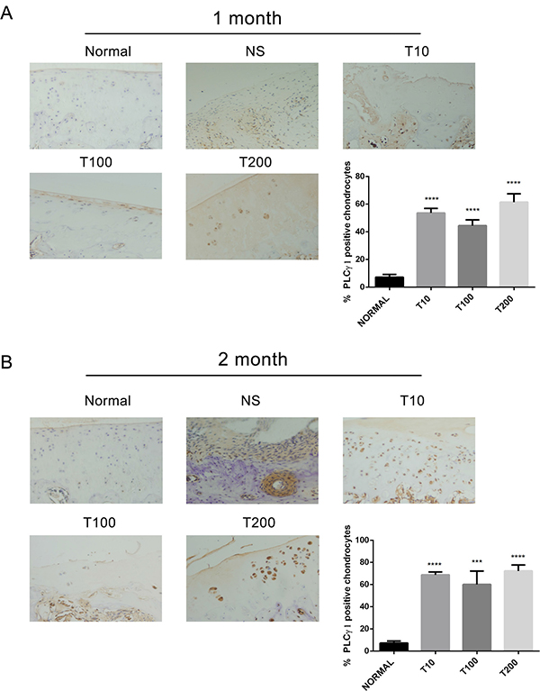 Figure 3: Effect of PLCγ1 inhibitor on Aggrecan expression in a rat OA model. Specimens were longitudinally cut into 3 μm sections and the levels of Aggrecan expression level were detected by immunohistochemisty technique (original magnification ×200). As described in Material and Methods, the positive chondrocytes were counted and analyzed using Image-Pro Plus 6.0 Software and GraphPad Prism version 5. (A) Representative images from rats treated by PLCγ1 inhibitor for 1 month after ACLT+MMx (original magnification ×200). Graph indicating the percentage of positive chondrocytes expressing Aggrecan (***P < 0.001, vs normal group). (B) Representative images from rats treated by PLCγ1 inhibitor for 2 month after ACLT+MMx (original magnification ×200). Graph indicating the percentage of positive chondrocytes expressing Aggrecan.