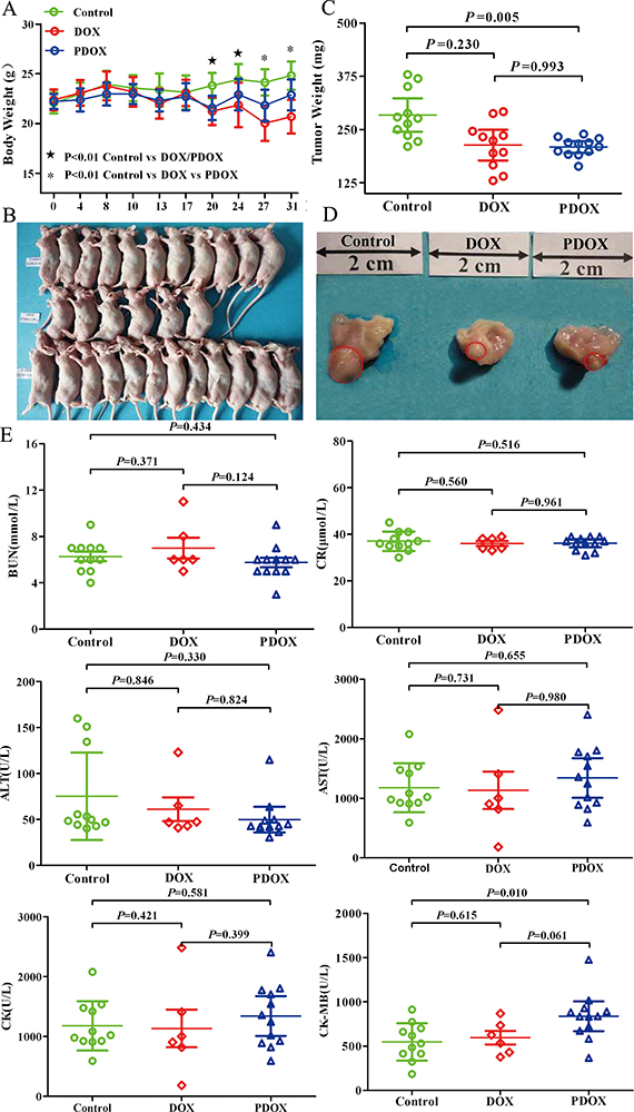 Figure 3: The general status of nude mice in SOI model. (A) The DOX animals showed significant weight loss from day 20, and weight decreases became progressively greater thereafter. From day 27 on, the weight differences between the DOX and PDOX groups became statistically significantly (P < 0.01). (B) Treatment effects of DOX and PDOX on general status of nude mice. In both control (upper row) and PDOX (lower row) groups, all mice survived to the study endpoint. By contrast, only half (6/12) animals survived to the study endpoint in the DOX group (middle row). (C) Effects of DOX and PDOX on tumor growth in the stomach. Compared with control, PDOX resulted in 22.9% reduction (P = 0.005) and 18.9% reduction (P = 0.230) in stomach tumor weight. (D) representative pictures of tumor on the stomach (red circles). (E) Effects of different cardiac, liver and renal function parameters are shown. Only 6 samples in the DOX group because of half of mice were died. E. Toxicity of major organs in SOI model.