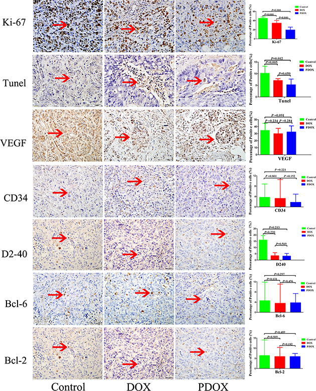 Figure 5: Effects of three therapies on angiogenesis, cell proliferation, and apoptosis of SOI tumor. Representative pictures of blood vessels and lymphatic stained with CD34, D2-40, proliferative cells stained with Ki-67, Bcl-2, Bcl-6, and apoptotic cells stained with Tunel antibodies in Control, DOX, PDOX group. Original magnification 40×, treatment with PDOX resulted in decreased Ki-67-positive cells.