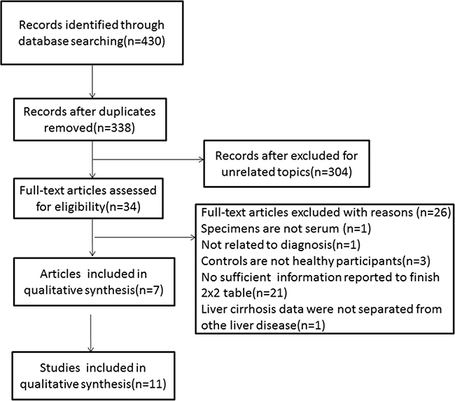 The inclusion criteria for the primary studies were as follows: (1) the study was a diagnostic study using serum miRNA; (2) the subjects included liver cirrhosis patients and healthy controls; and (3) sufficient information was available to construct 2 × 2 tables that consisted of the true positives (TPs), false positives (FPs), true negatives (TNs) and false negatives (FNs). Articles were excluded if the miRNAs were not detected using serum samples, if there was insufficient information reported to create a 2 x 2 table, and if the control groups were not healthy participants. The studies included in our meta-analysis were independently assessed by two investigators. All of the selected studies were managed using EndNote X7.