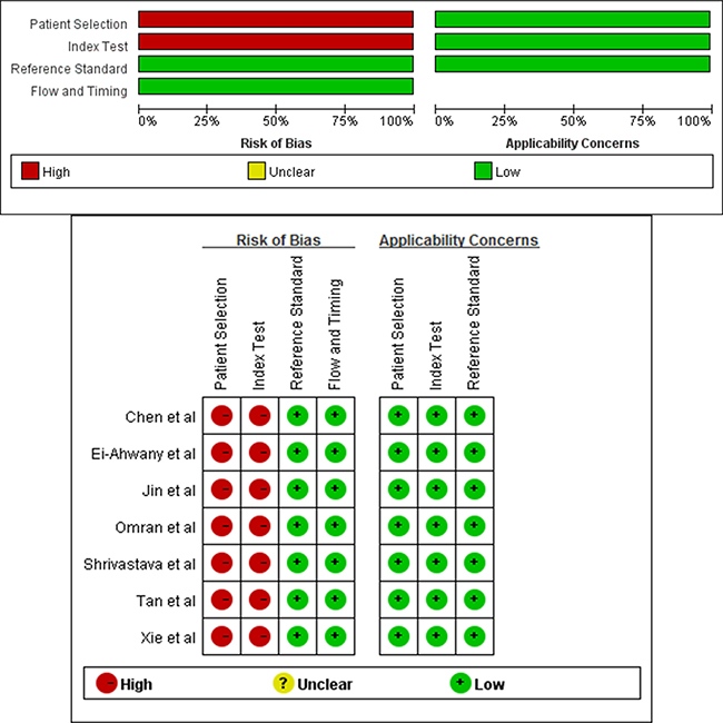 The first author’s name, year of publication, country, number of patients, miRNA type, liver disease, fibrosis stage and detection methods were collected from the eligible studies. Then, 2 × 2 tables that displayed the TP, TN, FP, and FN were created. The Quality Assessment of Diagnostic Accuracy Studies-2 (QUADAS-2) was used to evaluate the diagnostic accuracy qualities using the patient selection, index test, reference standard, and flow and timing [24].