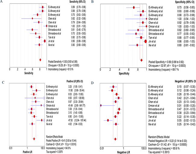 Figure 3: Forest plots of sensitivity (A), specificity (B), positive likelihood ratio specificity (C) and negative likelihood ratio specificity (D). The width of the horizontal line represents the 95% CI of each study; square proportional means the weight of every study. The weight is evaluated by the sample size and is presented as percent of total. The diamond represents pooled sensitivity, specificity, positive likelihood ratio specificity, negative likelihood ratio specificity and 95% CI.