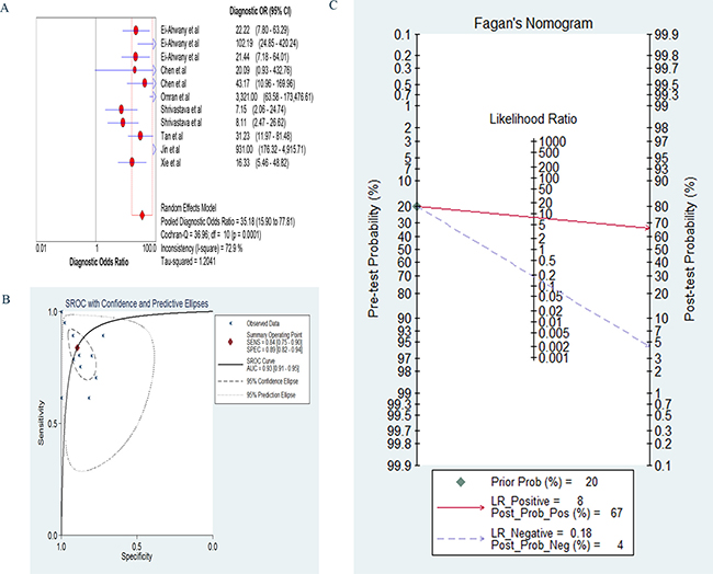 Figure 4: (A) The forest of diagnostic odds ratio specificity; (B) The pooled receiver operating characteristic curve: each X mark represents a study and AUC is the area under the curve; (C) Fagan’s Nomogram for calculation of post-test probabilities.