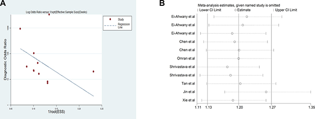 Figure 5: (A) Deek’s funnel plot indicates no significant publication bias (p = 0.239 > 0.05); (B) Sensitivity analysis plot of meta-analysis. Every row represents an included study. The width of the horizontal line represents the 95% CI for each study. The vertical bar on both sides represents the lowest and highest values of 95% CI.