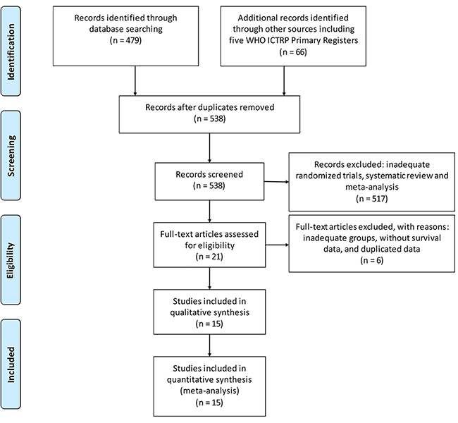 Initial searching of literature databases and trial registries revealed 479 published clinical trials and 66 registered ones (Figure 1). After removing 7 duplicates, 538 potentially eligible trials were left, of which 517 trials were excluded after reviewing the abstracts because the study design or outcome data did not satisfy the inclusion criteria. After reading the full text of the remaining 21 trials, 6 studies [20–25] were further excluded. The study of Feher et al. [20] was excluded because they used gemcitabine monotherapy in the experimental group, knowing that we only included studies with combination regimens containing gemcitabine. In addition, they enrolled postmenopausal women (aged 60 or older), which may produce selection bias for our analysis. The study of Park et al. [22] was also excluded because their patients were randomized to receive a combination of gemcitabine and vinorelbine or gemcitabine until disease progression followed by vinorelbine monotherapy. In Tomova et al.’s study [25], the patients were randomized to receive gemcitabine plus docetaxel administered intravenously for a total of eight cycles or four cycles of docetaxel followed by four cycles of gemcitabine. In Seidman et al.’s study [23], a crossover design was used. In above 3 studies [22, 23, 25], gemcitabine was used in both experimental and control groups, which was not eligible for our analysis. In Moinpour et al.’s study [21], survival data were not available. In another study published in 2014 by Seidman et al. [24], a pooled result was from Chan et al.’s study [26] and Seidman et al.’s study [23]. For these reasons, we excluded above six studies and enrolled the rest 15 studies [12–18, 26–33] in our systematic review (The Selection flow was is shown in Figure 1).