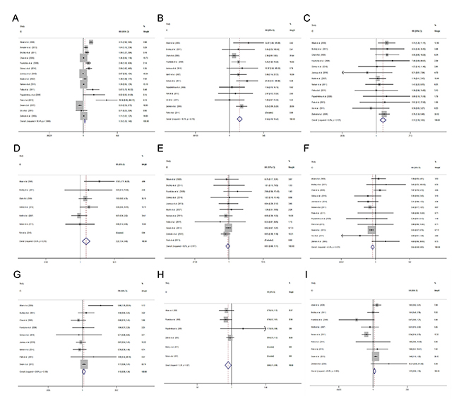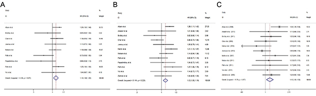 Altogether 10 studies used gemcitabine as the first-line treatment [12–15, 17, 18, 27, 28, 32, 33] and the other 5 studies [19, 26, 29–31] used gemcitabine as the second-line chemotherapy. In studies using gemcitabine as first-line treatment, patients with gemcitabine-containing regimens had a significantly longer OS (HR = 1.19, 95% CI 1.07 to 1.32) (Figure 4A), PFS (HR = 1.17, 95% CI 1.08 to 1.27) (Figure 4C) and a higher ORR (RR = 1.16, 95% CI 1.02 to 1.32) (Figure 4E) than patients with non-gemcitabine-containing regimens. However, the trend is not seen in studies using gemcitabine as post first-line treatment (OS: HR = 0.98, 95% CI 0.81 to 1.18, Figure 4B; PFS: HR = 1.04, 95% CI 0.94 to 1.16, Figure 4D; ORR: RR = 1.15, 95% CI 0.92 to 1.45, Figure 4F).