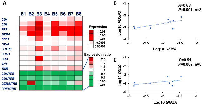 Figure 1: Expression profiles of immune-related genes in tumor microenvironment. (A) Heatmap of mRNA expression levels of 11 immune-related genes, TRB, CD4, CD8, FOXP3, PD-1, OX40, GZMA, PRF1, PD-L1, IL10, and TIM3 normalized by GAPDH expression levels in 8 SCCHN tumors. Correlation analysis of expression levels: GZMA to FOXP3 (B) and OX40 to GZMA (C).