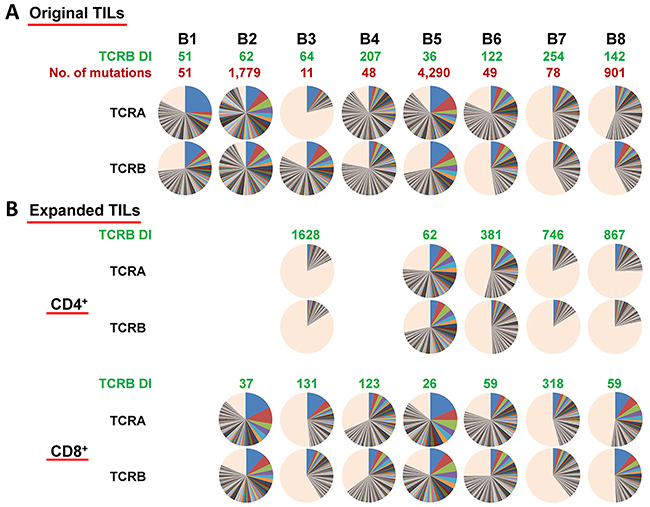 Figure 2: (A) Distribution of both TCR-α and TCR-β CDR3 unique clonotypes, the numbers of mutations in individual tumors as well as TCR-β DIs in original TILs in SCCHN tumors. (B) Distribution of both TCR-α and TCR-β CDR3 unique clonotypes and TCR-β DIs in expanded CD4+/CD8+ TILs. Pie charts depict clonotypes with 0.1% frequency or higher in each patient. Common colors among different pie charts do not represent identical clonotypes. The light orange portion of each pie chart contains clonotypes with less than 0.1% frequency.