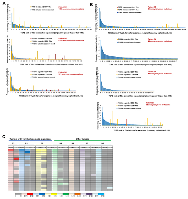 Figure 3: Comparison of TCR-β repertoire between TILs in original tumors and those expanded in vitro. (A) Comparison of TCR-β clonotypes of TILs before and after expansion in 3 tumors with very high mutational load. (B) Comparison of TCR-β clonotypes of TILs before and after expansion in remaining 4 tumors. The blue bars represent the frequencies (ordered by the frequencies from highest to lowest) of the common CDR3 clonotypes (the frequency of 0.1% or higher in all mapped TCR reads) in TILs in the original tumors (a mixture of CD4+ and CD8+ cells). The orange bars represent the frequencies of CDR3 clonotypes in expanded CD8+ populations and the red bars represent those in the expanded CD4+ populations. (C) Heatmap showing changes between original top 20 clones before and after in vitro expansion. For each patient, TCR-β repertoire data of original TILs (represented by original), expanded CD8+ TILs (represented by EX-CD8), expanded CD4+ TILs (represented by EX-CD4) are listed. The frequencies of individual CDR3 clonotypes are indicated by graduation of colors and different colors on the bottom of the heatmap indicate individual patients.
