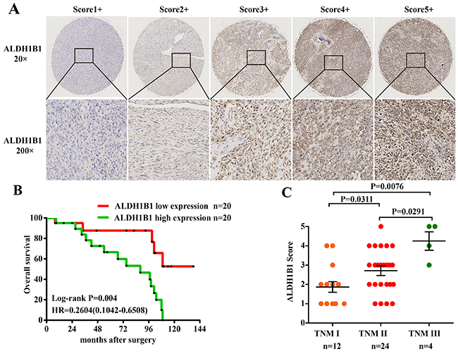 Figure 1: Association of ALDH1B1 expression and clinical significance in our OS patients. (A) Representative images of different immunohistochemical staining intensities of ALDH1B1 are shown in OS tissues. The percentage of cells showing positive staining was calculated by reviewing the entire spot. On the basis of the percentage, the staining patterns were categorized into 5 groups: 1, 1+, positive cells <10%; 2, 2+, positive cells 10% to 25%; 3, 3+, positive cells 26% to 50%; 4, 4+, positive cells 51% to 75%; and 5, 5+, positive cells >75%. (Original magnification, ×400). (B) Kaplan-Meier analysis was used to analyzed the overall survival of OS patients with low ALDH1B1 expression (score 1+, 2+ and 3+) and high ALDH1B1 expression (score 4+ and 5+). (C) Distribution of ALDH1B1 staining scores among the patients with TNM I, II and III stages.
