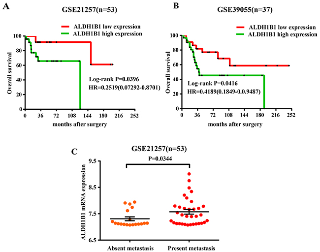 Figure 2: Association of ALDH1B1 expression and prognosis of OS patients by analyzing the GEO database. Kaplan-Meier were used to analyzed the overall survival of OS patients with low ALDH1B1 expression and high ALDH1B1 expression in GSE21257 (A) and GSE39055 (B). (C) Distribution of ALDH1B1 staining scores among the patients with metastasis and without metastasis in GSE21257.