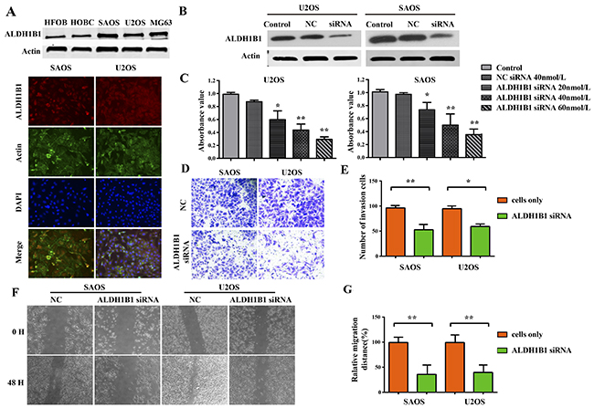 Figure 3: The role of ALDH1B1 in the growth and proliferation, invasion and migration of OS cells. (A) The expressions of ALDH1B1 in OS cell lines (SAOS, U2OS and MG63) and normal human osteoblast cell lines (HFOB and HOBC) were determined by western blot and Immunofluorescence assay. (B) Downregulated expression of ALDH1B1 by synthetic siRNA in SAOS and U2OS cell lines under the different ALDH1B1 siRNA concentrations (20, 40 and 60 nmol/L). (C) Downregulated expression of ALDH1B1 inhibited the proliferation of OS cells by MTT assay. Downregulated expression of ALDH1B1 inhibited the invasion of OS cells by transwells assay (D, E). Downregulated expression of ALDH1B1 inhibited the migration of OS cells by wound healing assay (F, G).