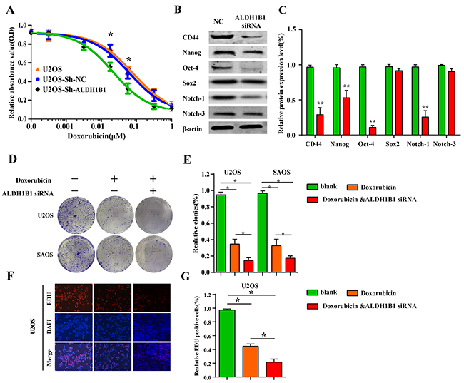 Figure 5: The role of ALDH1B1 in drug resistance and stemness of OS cells. (A) Downregulated expression of ALDH1B1 increased the cell sensitivity of chemotherapy (doxorubicin) by drug sensitivity assay. In the presence of doxorubicin, downregulated expression of ALDH1B1 further inhibited the colony formation (D, E) and proliferation abilities of OS cells (F, G). The role of ALDH1B1 on the protein expressions of cancer stem cell markers, including CD44, Nanog, Oct-4 and Notch-1 (B, C).