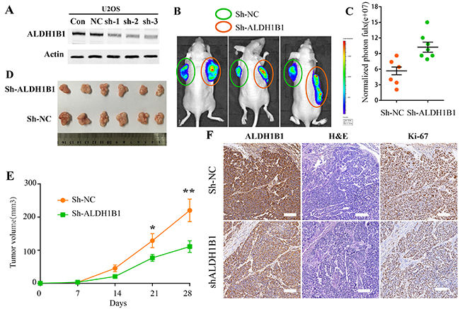 Figure 6: The roles of ALDH1B1 in OS in vivo. (A) Downregulated expression of ALDH1B1 in OS cells via shRNA was confirmed by western blot. The tumor growth was detected by In-Vivo Imaging Systems (B, C) and by tumor volumes (D, E). (F) Immunohistochemistry staining of ALDH1B1 and Ki67 in OS tissues from nude mice.