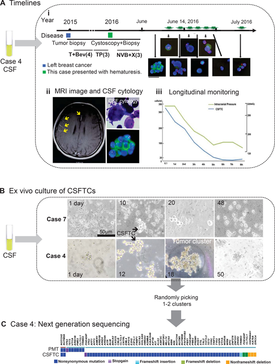 Figure 1: Overview of SE-i•FISH platform for dynamic monitoring and ex vivo culture of CSFTCs. (A) The treatment timelines received by the patient (NM04). (i) From 2015 until 2016, the patient received four cycles of adjuvant T+Bev (Paclitaxel/Bevacizumab) and three cycles of TP (Paclitaxel/DDP) chemotherapy. In January 2016, the patient presented with hematuresis. Following urethrocystoscopy biopsy, the patient received three cycles of NVB+X (Vinorelbine/Capecitabine). The treatment had to stop as she presented with excruciating headache and vomiting. On the basis of the diagnosis of leptomeningeal metastases by MRI and CSF cytology, the patient received regularly intrathecal methotrexate and cytarabine. Green arrows mean intrathecal chemotherapies. The immunofluorescent staining for cytokeratin (CK, green), chromosome 8 (Yellow), CD45 (Red), and nuclei (DAPI, blue). (ii) Representative images of MRI and CSF cytology. (Upper right panel) Light microscopic imaging with Papanicolaou staining. (iii) The number of CSFTCs and the intracranial pressure are shown in the right panel. (B) Ex vivo culture of CSFTCs. 5–10 ml CSF were obtained from patients and then enriched. CSFTCs were cultured in a medium without serum under suspension culture conditions. The CSFTCs of NM04 and NM07 could be expanded in short term as indicated. Scale bar, 50 μm. (C) At Day 18, the tumor clusters of case NM04 were randomly picked. The exome sequencing was performed on DNA extracted from CSFTCs and the paired primary tumor. The distribution of somatic mutations detected by exome sequencing is presented in a heat map.