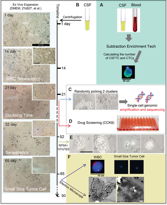 Figure 3: Ex vivo expansion of CSFTCs from case NM01. The left panel showed representative images of ex vivo culture of CSFTCs. The CSFTCs could be expanded for more than seven weeks, but after 90 days they gradually underwent senescence. (A) The number of CTCs in blood and CSFTCs were recorded by the SE-i•FISH platform. (B) Cerebrospinal fluid was collected and centrifuged. Subsequently, CSFTCs were enriched by subtraction enrichment (SE) technology. (C) At Day 21, cultures appeared tumor clusters, and then two tumor clusters were picked for single-cell genomic amplification and exome sequencing. (D) Ex vivo drug sensitivity test was assessed by CCK8 assay. (E) The morphological changes of CSFTCs were observed, when the special non-serum medium was switched to the medium with 10% FBS. At Day 65, we observed the small size cells. Representative images of immunofluorescence (up) and scanning electron microscope (down) are shown in (F).