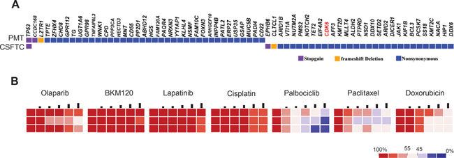Figure 4: Drug sensitivity on CSFTCs as a potential predictive tool for treatment response. (A) The distribution of somatic mutations detected by exome sequencing was presented in a heat map. (B) Heatmaps represent cell viability after treatment of selected anticancer drugs. Each concentration represents a 2-fold increase from the previous dose, with each concentration tested in triplicate.