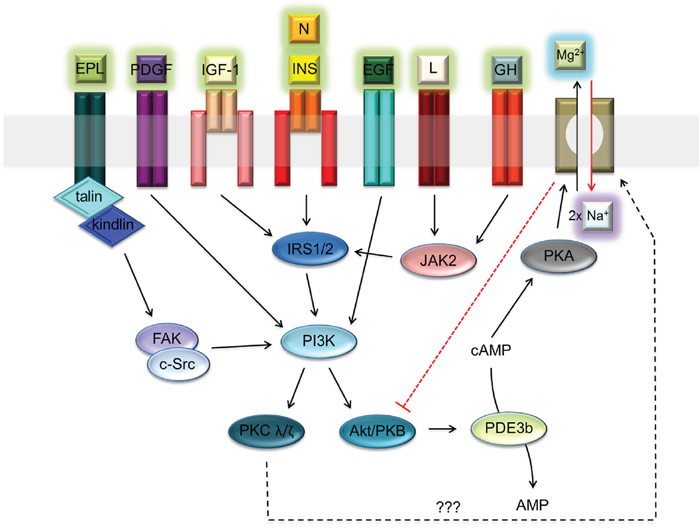 The function of A1 is regulated by cAMP-dependent protein kinase A (PKA) [5–7]. The increased PKA-dependent phosphorylation of SLC41A1 leads to an increase of Mg2+ efflux capacity in transgenic HEK293 cells [5, 6]. Levels of intracellular cAMP are controlled by various hormonal stimuli [13]. In several reports, the authors have demonstrated either the inhibitory (e.g., insulin; INS) or stimulatory (e.g., angiotensin II; ANG) effects of hormones on NME performance [13–15]. In particular, the inhibitory effect of INS may play a protective role against the excessive loss of Mg2+ from cells. The INS signaling axis IRTK – PI3K – Akt/PKB with the end effector phosphodiesterase 3b (PDE3b) is assumed to regulate (decrease) the level of cAMP and consequently also of PKA-dependent SLC41A1 activation [13]. Many other extracellular signals might influence the activity of the PI3K-Akt/PKB signaling node. Among these are neuritin signaling via IRTK – PI3K – Akt/PKB; platelet-derived growth factor (PDGF) signaling via PDGFR – PI3K – Akt/PKB; epidermal growth factor (EGF) signaling via EGFR – PI3K – Akt/PKB; insulin-like growth factor 1 (IGF-1) signaling via IGF-1R – PI3K – Akt/PKB; leptin (L) signaling via the LR – JAK2 – IRS2 signaling switch; growth hormone (GH), interferon-gamma (INFγ), and leukemia inhibitory factor (LIF) signaling via the GHR/INFγR/LIFR – JAK2 – IRS1 signaling switch; and extracellular polyvalent-ligand-activating integrin-linked FAK/c-Src dual kinase - PI3K - Akt/PKB signaling (Figure 1) [16–23]. Therefore, a reasonable assumption is that the activity of SLC41A1 in various tissues is regulated by the interplay of various extracellular signals translated into the activity of the PI3K-Akt/PKB signaling node.
