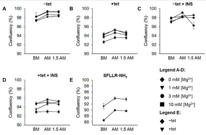 Figure 3: Cell confluence assessed by using in-well imaging before the application of the particular effector(s), immediately after measurements, and 1. 5 hour after the end of measurements. Measurements were performed with –tet (A, C, E) and with +tet HEK293 cells (B, D, E) without INS (A, B) or with INS (400 μU/mL; C, D) in CMF-HBSS+. [Mg2+]e are indicated. Data are presented as means (for A – D, N = 12 – 15; for E, N = 9) ± SE. Abbreviations: 1.5 AM, 1.5 hrs after measurement; AM, after measurement; BM, before measurement; INS, insulin; SFLLR-NH2, protease-activated receptor 1 activating peptide; tet, tetracycline.