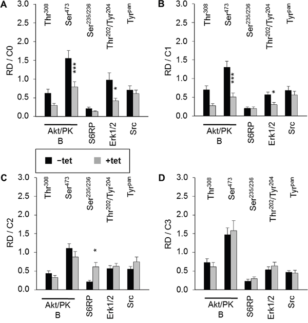Figure 5: Pairwise comparison of averaged relative densities of particular phospho-signals (Akt/PKB-Thr308, Akt/PKB-Ser473, S6RP-Ser235/236, Erk1/2-Thr202/Tyr204, Src-Tyrpan) in –tet (control) and +tet (SLC41A1-overexpressing) HEK293 cells treated with (A) C0, (B) C1, (C) C2, or (D) C3, as obtained with PathScan® RTK Signaling Antibody Array (see Figure 4 for details). Each averaged density value results from six independent biological experiments (N/n = 6/12; respective phospho-signals were detected on chips in duplicate). Data are presented as means ± SE; *P < 0.05, ***P < 0.001. Abbreviations: Akt/PKB, protein kinase B; C, condition; Erk1/2, extracellular signal-regulated kinase 1/2; RD, relative density; S6RP, S6 ribosomal protein; Src, proto-oncogene tyrosine-protein kinase Src; tet, tetracycline.