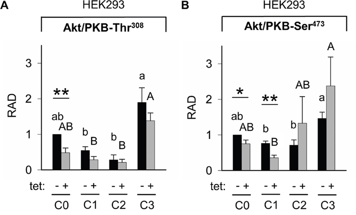 Figure 8: Pairwise comparison of relative adjusted densities of Akt/PKB-Thr308 (A) and Akt/PKB-Ser473 (B) phospho-signals and between-treatments (C0, C1, C2, C3; see Figure 4 for details) comparison of relative adjusted densities of Akt/PKB-Thr308 (A) and Akt/PKB-Ser473 (B) phospho-signals in –tet (control) and +tet (SLC41A1-overexpressing) HEK293 cells, obtained with WB. Data are presented as means (N = 5) ± SE. Pairwise comparisons: Significance is indicated (*P < 0.05, **P < 0.01). Between-treatment comparisons: Labeled means without a common letter differ (P < 0.05). Small letters were used for the between-treatment comparisons in –tet group and capital letters in +tet group. Abbreviations: Akt/PKB, protein kinase B; C, condition; RAD, relative adjusted density; tet, tetracycline; WB, Western blot.