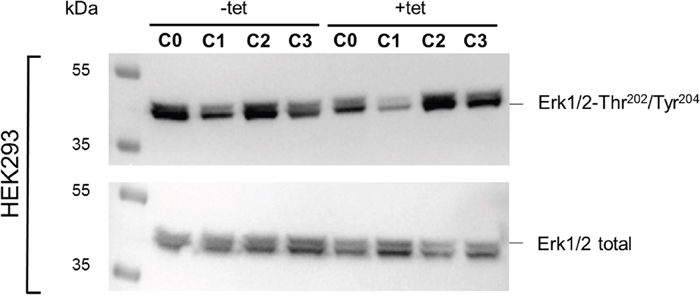 In between-treatments comparisons of Erk1/2-Thr202/Tyr204 phosphorylation in –tet cells, we found a significant (P < 0.05) difference between treatment C0 and C1 (Supplementary Figure 9). The same comparison in +tet cells revealed no significant differences between particular conditions (Supplementary Figure 9).