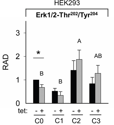 The comparisons of the Erk1/2-Thr202/Tyr204 phosphorylation between treatments revealed the significantly (P < 0.05) higher level of Thr202/Tyr204 phosphorylation in +tet cells after C2 when compared with C0 and C1 (Figure 10). However, this was not the case in –tet cells (Figure 10).