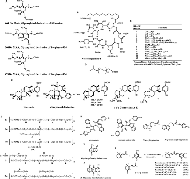 Figure 3: Chemical structures of common bioactive compounds from N. commune. (A) Structure of glycosylated mycosporine-like amino acids [17, 49]. (B) Structure of an antifungal lipopeptide [33]. (C) Structure of diterpenoid derivatives which is uncommon in cyanobacteria [23–25]. (D) Structure of a long chain fatty acid [18]. (E) Structure of oligosaccharides isolated after weak acid hydrolysis of the acidic polysaccharide [11]. (F) Structure of Nc-5-s, a complex heteroglycan, composed of repeating units of 1, 1a, 1b and 2 and 2a in molar ratio of (10:25:50:5:10) [13, 66]. (G) Structure of an indane derivative [25]. (H) Structure of indole alkaloids [7, 8, 27, 41]. (I) Structure of β-ionone derivatives [4, 27, 41]. (J) Structure of an anthraquinone derivative [25].