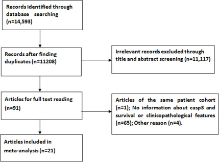 Studies were considered eligible if they met the following criteria: (i) Studies that demonstrated caspase-3 expression in breast cancer tissues; (ii) Studies that evaluated the relationship between caspase-3 expression and clinicopathological parameters, progress or prognosis of breast cancer; (iii) The language of publications was English or Chinese; (iv) Studies that provided sufficient information to assess the hazard ratios (HR) of overall survival (OS), disease-free survival (DFS), post-relapse survival (PRS) or relapse-free survival (RFS), or to evaluate odds ratios (OR) associated with clinicopathological features and their corresponding confidence intervals (CI). If the data were not provided directly, the value had to be inferable from adequate clinic data and/or the reported tables; (v) If multiple publications were found representing the same data, or were written by the same authors, the most informative and most recent publications were selected.