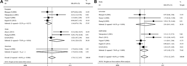 Figure 3: Forest plots of merged analyses of OS and expression of caspase-3 in different subgroups. (A) Ethnicity subgroup: The results revealed that high caspase-3 expression was significantly associated with poor OS in the Asian subgroup (HR = 3.16, 95%CI 1.20–8.35, P = 0.020), (B) Analytical methods subgroup: The results revealed that caspase-3 was a risk factor for breast cancer patients using multivariate overall survival analysis (HR = 1.67, 95%CI 1.02–2.75, P = 0.044), but no statistical significance was found using univariate subgroups (HR = 2.01, 95%CI 0.61–6.65, P = 0.254).