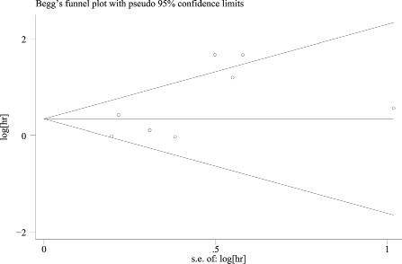 Figure 6: Begg’s funnel plot of publication bias for OS: There was no evidence of asymmetry in the funnel plots for OS.