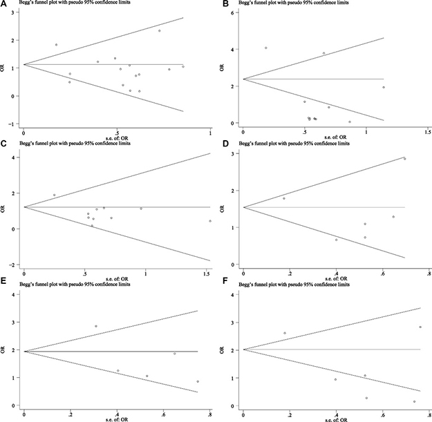 Figure 7: Begg’s funnel plot of publication bias for clinicopathological features. (A) Lymph nodes metastases (–/+) (random-effects model), (B) Tumor differentiation grade (low, moderate or high differentiated) (random-effects model), (C) Tumor TNM stage (I–II/III-IV) (random-effects model), (D) PR status (–/+) (fixed-effects model), (E) HER-2 status (–/+) (fixed-effects model), (F) ER status (–/+) (random-effects model): The results indicated a slight bias in tumor differentiation grade and ER status with their P values being 0.005, 0.042, respectively.