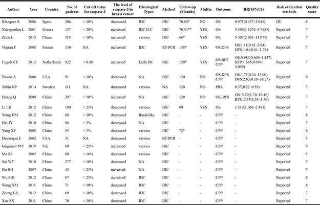 Twenty-one studies met the inclusion criteria, with a range from 31 to 822 patients per study. The published years of all the studies were between 2001 and 2015. Additionally, among the included studies, 12 were conducted in China, two were carried out in the USA, and the rest originated from Spain, Greece, France, Netherlands, Sweden, Korea and the UK. The caspase-3 status in tissue samples was determined by immunohistochemical (IHC) staining in 18 studies, and real-time polymerase chain reaction (RT-PCR) technology was used in two articles. However, one of the included studies did not mention the precise testing method. Of the 21 studies, nine reported prognostic effect values. Eight of them concentrated on the relationship between caspase-3 expression and OS. Two provided the DFS and RFS rates. Only one offered information about PRF. In addition, four prognostic studies provided the HRs and 95%CI from multivariate analyses. Regarding the methodological quality of all studies, only two of them received scores of five or lower, which suggested they were of relatively low quality. The remaining 19 articles all had scores of six or higher, suggesting better methodological quality. The main characteristics of the 21 enrolled studies are summarized in Table 1.