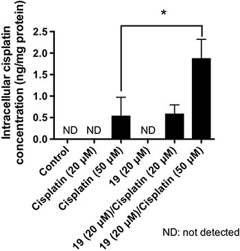 Figure 3: Compound 19 enhances the accumulation of intracellular cisplatin in ovarian CSC-LCs. A2780cis ovarian cancer cells were stained with an ALDEFLUOR kit, and the cells with high ALDH activity were collected by cell sorting through flow cytometry. ALDH-high CSC-LCs were then treated as indicated for 3 h. The intracellular concentration of cisplatin was determined by flameless atomic absorption spectrometry (AAS). Data represent mean ± SD from three independent experiments. *P < 0.05. ND, not detected.