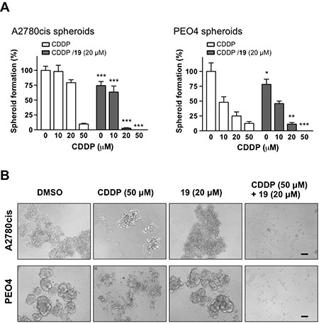 Figure 4: The combination of compound 19 with cisplatin prevents sphere formation from cisplatin-resistant cell subpopulation. Monolayer A2780cis and PEO4 ovarian cancer cells were treated with cisplatin alone, compound 19 alone, or the combination for 3 h. Compounds were then washed away and the cells were transferred to ultra-low attachment tissue culture plates to allow the formation of spheroids from surviving population of cisplatin-resistant cells. After seven days, the growth of spheroids were quantified by MTS assay (A). Data represent mean ± SD. Student’s t-test was performed for comparisons between groups treated with the combination of cisplatin with compound 19 and groups treated with cisplatin alone at the same concentration. *P < 0.05, **P < 0.01, ***P < 0.001. (B) Representative images of spheroid formation at the indicated treatment conditions. Scale bars, 30 μm.