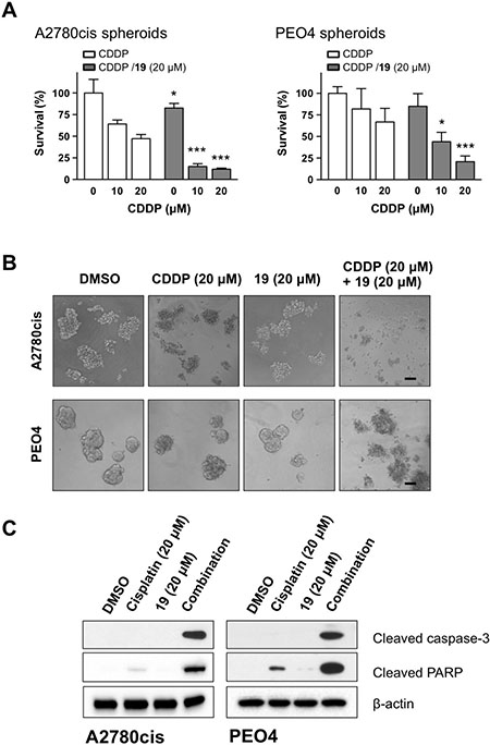 Figure 6: The combination of compound 19 with cisplatin enhances apoptosis in ovarian cancer spheroids. (A) Five-day old spheroids generated from A2780cis and PEO4 ovarian cancer cells were treated as indicated for 48 h. Cell viability was determined by a MTS assay. Data represent mean ± SD. Student’s t-test was performed for comparisons between groups treated with the combination of cisplatin with compound 19 and groups treated with cisplatin alone at the same concentration. *P < 0.05, **P < 0.01, ***P < 0.001. (B) Representative images of spheroids 48 h after treatment with cisplatin alone, compound 19 alone, or the combination. Scale bars, 30 μm. (C) Apoptotic cell death of spheroids from A2780cis and PEO4 cells was evaluated by Western blot.