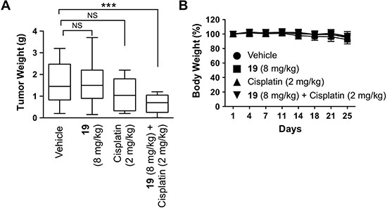 Figure 7: The combination of compound 19 with cisplatin reduces tumorigenesis in vivo. A2780cis intraperitoneal ovarian cancer mouse model was utilized to study the effect of compound 19 alone, cisplatin alone, or the combination on the growth of ovarian tumor in vivo. 10 million A2780cis cells were injected intraperitoneally on day 1 in each Fox Chase SCID mouse. Beginning three days after tumor cell inoculation, drugs were administered intraperitoneally twice a week for three weeks. Body weight was measured twice a week. Mice were sacrificed on day 25, and intraperitoneally developed tumor nodules were collected and weighed. Each group contained 20 mice. Significance was determined by one-way ANOVA and Tukey multiple comparison test. ***P < 0.001, NS, non-significant.
