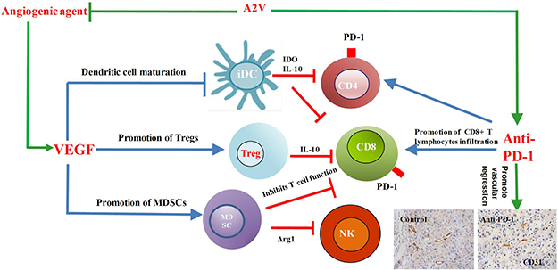 VEGF: Vascular endothelial growth factor; iDC: Immature dendritic cell; Treg: T-regulatory cell; MDSC: Myeloid-derived suppressor cell; CD4:Cluster of differentiation 4; CD8:Cluster of differentiation 8; NK: Natural killer cell; IDO: Indoleamine 2; Arg1: Arginase 1; IL-10: Interleukin-10; PD-1:Programmed cell death protein-1; A2V: Bispecific antibody to angiopoietin-2 (ANGPT2) and Vascular endothelial growth factor A (VEGFA).