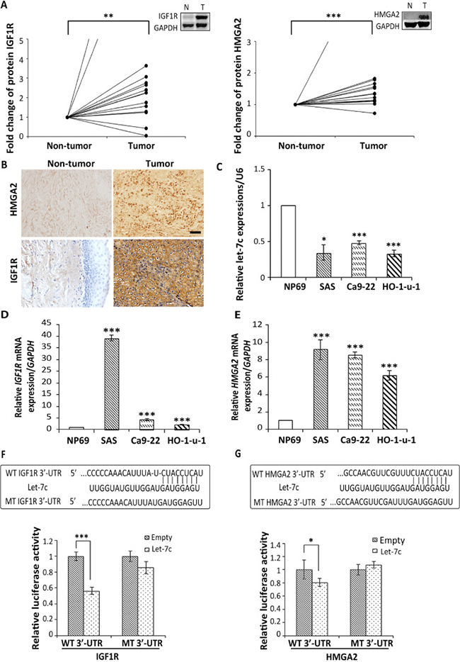 Figure 1: Let-7c directly binds to the 3′-UTRs of IGF1R and HMGA2. Relative protein levels of (A) IGF1R and HMGA2. IGF1R and HMGA2 in HNSCC tumor tissues and adjacent non-tumor tissues (n = 15) were examined by western blot analysis with GAPDH serving as loading control. Thereafter, the target protein levels were calculated as fold change compared to paired non-tumor levels. Non-tumor levels were set as 1. Statistical analysis was performed using the Student’s paired t-test. (B) Representative IHC staining of IGF1R and HMGA2 in HNSCC tumor tissues and adjacent non-tumor tissues. Original magnification ×100 and ×200; bar represents 50 μm. Expression of (C) Let-7c, (D) IGF1R, and (E) HMGA2 in HNSCC cell lines SAS, Ca9-22, and H0-1-u-1 compared to non-malignant nasopharyngeal epithelial cell line NP69. Let-7c-binding sites in the IGF1R and HMGA2 3′-UTRs were predicted by TargetScan. (F) 2619–2626nt of the IGF1R 3′-UTR sequence and (G) 21–28nt of the HMGA2 3′-UTR sequence, as well as the complementary let-7c binding sequences and the target mutated sequences, are shown in the boxed rectangles. For the luciferase reporter assays, SAS cells were co-transfected with 50 ng of PCMV-MIR vector or PCMV-MIR-let-7c vector and 100 ng dual-luciferase vector containing either wild-type or mutant 3′-UTR of (F) IGF1R and (G) HMGA2. The relative firefly luciferase activity normalized with renilla luciferase was measured 24 h after transfection. Statistical analysis was performed using the Student’s t-test. *P < 0.05; **P < 0.01; ***P < 0.001.