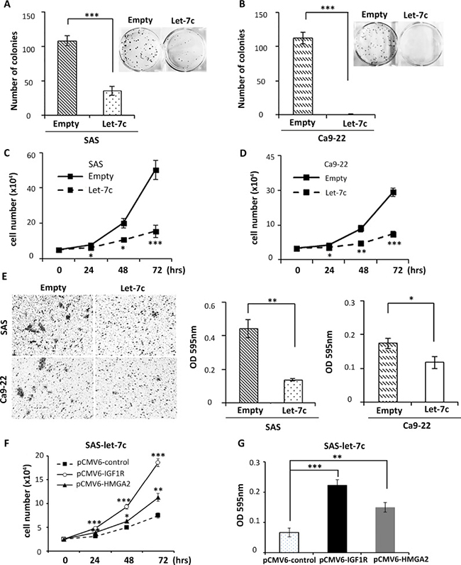 Figure 3: Let-7c inhibits colony formation, proliferation, and migration in HNSCC cell lines. HNSCC cell lines SAS and Ca9-22 were transfected with either pCMV-MIR vector or pCMV-MIR-let-7c vector. Cells were subjected to assays of (A, B) colony formation, (C, D) proliferation, and (E) migration to examine growth of in vitro cancer cell cultures. P-values were calculated using the Student’s t-test. Following re-expression of IGF1R or HMGA2 in SAS-let-7c cells using pCMV6-IGF1R or pCMV6-HMGA2, cells were subjected to assays of (F) proliferation and (G) migration. P-values of F and G were derived from two-way ANOVA and one-way ANOVA followed by Bonferroni correction, respectively. *P < 0.05; **P < 0.01; ***P < 0.001.