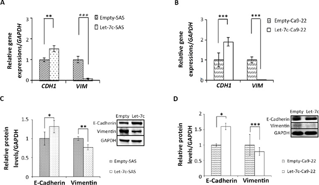 Figure 4: Let-7c inhibits EMT in HNSCC cell lines. (A, B) CDH1 and VIM mRNA levels in let-7c-expressing cell lines were determined by RT-qPCR, and (C, D) E-cadherin and vimentin protein levels were examined by western blot analysis in SAS and Ca9-22, respectively, two HNSCC cell lines stably expressing let-7c. GAPDH served as loading control. P-values were calculated using the Student’s t-test. *P < 0.05; **P < 0.01; ***P < 0.001.