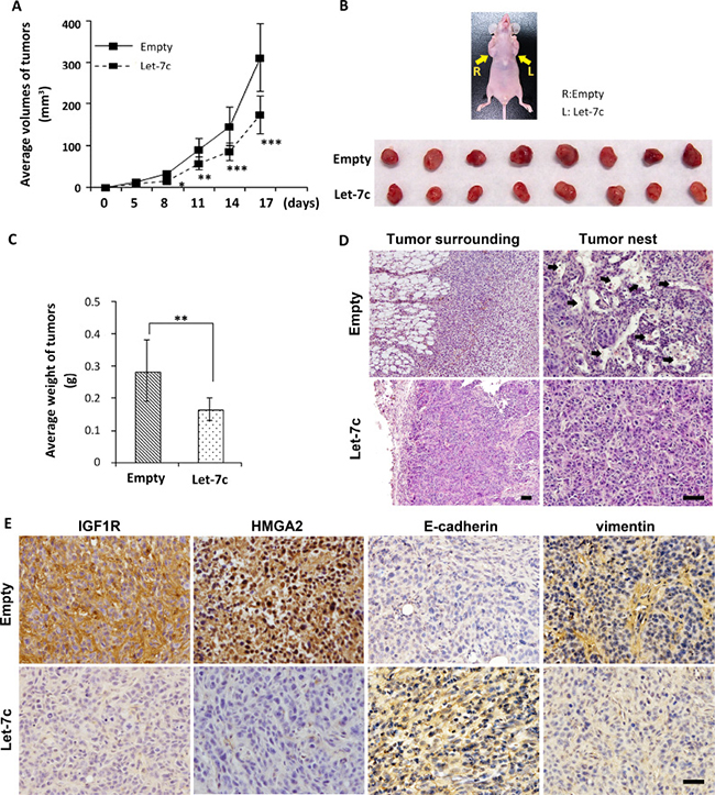 Figure 5: Let-7c inhibits HNSCC tumor growth and infiltration. (A) Growth curves were drawn by measuring tumor volumes at the indicated times. (B) Image of subcutaneous xenografts in the mouse flanks (the arrows indicate tumor locations in a mouse injected with (L) SAS cells stably expressing let-7c or (R) control SAS cells) and excised tumors. (C) Weight of xenograft tumors. (D) H&E staining demonstrating growth properties. Arrows point to blood vessels in the cancer nests. (E) Representative IHC staining of IGF1R, HMGA2, E-cadherin, and vimentin in the xenograft tumors. Nuclei were counterstained with hematoxylin. Original magnification ×100 and ×200; bars represent 50 μm. P-values of differences between let-7c and control tumors were calculated using the Student’s paired t-test. *P < 0.05, **P < 0.01, ***P < 0.001.