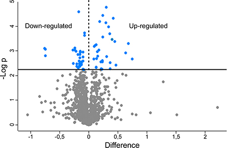 Figure 1: Volcano plot obtained from SILAC-based quantitative proteomics analysis. Blue dots represent proteins exhibiting significative fold changes.