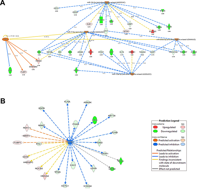 Upstream Regulator Analysis (URA) is another tool of IPA allowing to predict the upstream molecules (transcription factor, microRNA) that could have a causal role in the observed proteome profiling. Submitting to IPA/URA our dataset, we obtained the enrichment of 5 precursors that we can distinguish in two clusters (Figure 5A). The first one is characterized by the predicted activation of 4 tumor suppressor miRNAs (miR-133a-3p, miR-203a-3p, miR-17-5p, miR-124-3p) [27–30]. These miRNAs are associated to the expression control of proteins already evidenced by DEA to be related to increase of cell death and decrease of invasiveness.